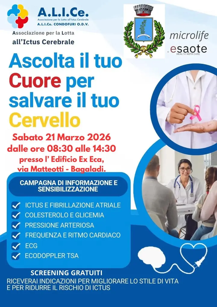 Giorno 21 Marzo 2026, presso l’ Edifico Ex ECA - Suor Teresilla di Bagaladi, si è svolta la giornata di prevenzione alla patologia Cerebro e Cardiovascolare organizzata dall’ Associazione “A.L.I.Ce Condofuri ODV” con il patrocinio del Comune di Bagaladi (RC). L’iniziativa fa parte di un progetto di